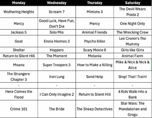 Projections: Mercy, Send Help, The Moment, Solo Mio, The Strangers: Chapter 3, Wuthering Heights, Goat, Crime 101; Good Luck, Have Fun, Don’t Die; Psycho Killer, I Can Only Imagine 2, How to Make a Killing, Scream 7, The Bride, Hoppers