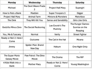 Projections: Project Hail Mary, Ready or Not 2: Here I Come, They Will Kill You, The Super Mario Galaxy Movie, The Drama; You, Me & Tuscany; Lee Cronin’s The Mummy, Mother Mary, Michael, The Devil Wears Prada 2, Animal Farm, Hokum