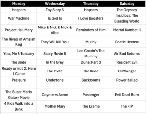Projections: The Bride, Hoppers, Reminders of Him, Undertone, Project Hail Mary, Ready or Not 2: Here I Come, They Will Kill You, The Super Mario Galaxy Movie, The Drama, In the Grey; You, Me & Tuscany; Lee Cronin’s The Mummy, Mother Mary