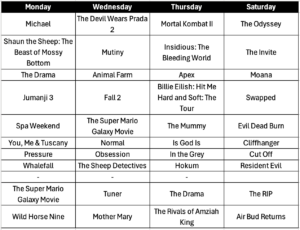 Projections: The Super Mario Galaxy Movie, The Drama; You, Me & Tuscany; Lee Cronin’s The Mummy, Mother Mary, Michael, The Devil Wears Prada 2, Animal Farm, Hokum, Mortal Kombat II, Billie Eilish: Hit Me Hard and Soft: The Tour, The Sheep Detectives, Is God Is, Obsession, In the Grey